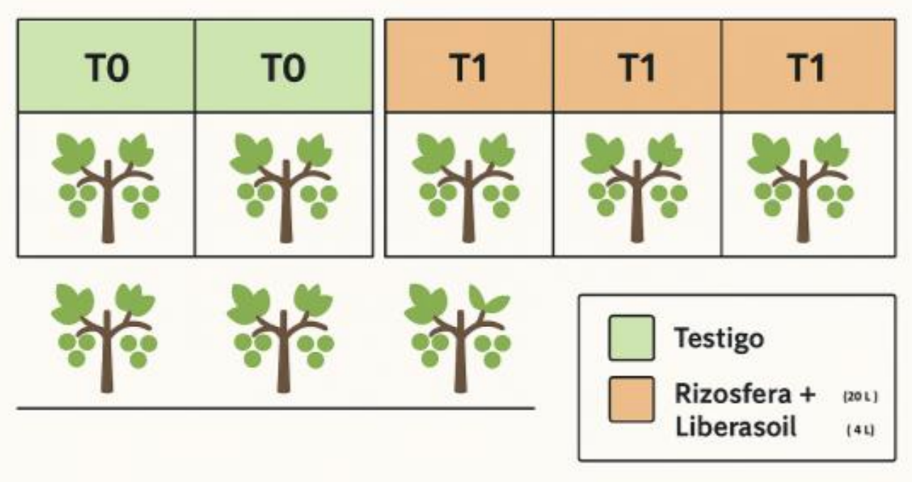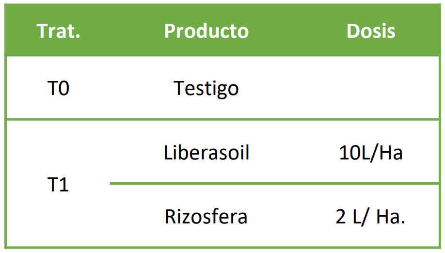 Se empleó un diseño experimental con dos tratamientos: Testigo (sin aplicación) y Rizósfera (2L/ha)+ Liberasoil( 10L/Ha), las cuales se realizaron vía sistema. Se aplicó en una sola dosis