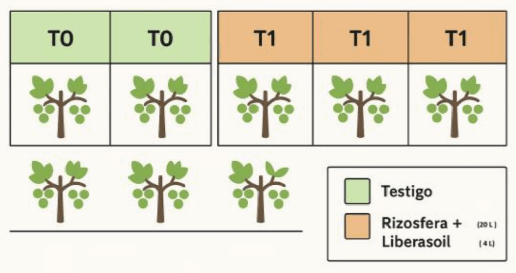 Para evaluar el efecto de la combinación de Liberasoil+ (10 L/ha) + Rizosfera (2 L/ha) sobre el desarrollo radicular en uva de mesa, se aplicó un enfoque estadístico factorial utilizando un Análisis de Varianza (ANOVA) de dos factores independientes. Los factores evaluados fueron el tratamiento (testigo vs. tratamiento) y el tiempo de evaluación (0 DDA y 67 DDA).