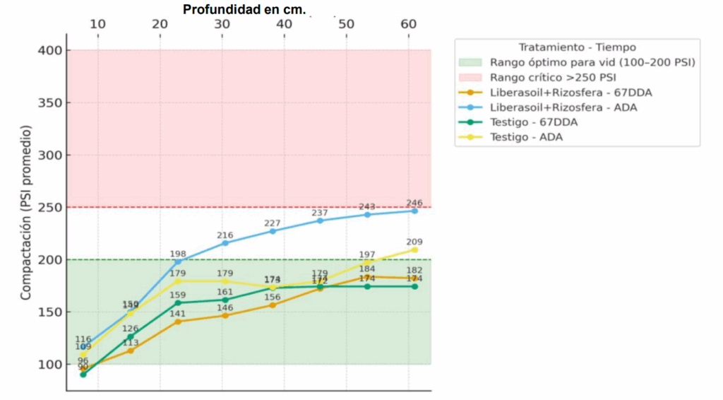 La resistencia a la penetración (PSI) es un indicador crítico de la compactación del suelo y de su capacidad para permitir el crecimiento radicular. Valores superiores a 200 PSI en las capas de 30-60 cm pueden restringir el desarrollo radicular y limitar la exploración de agua y nutrientes (Bengough et al., 2011). La aplicación de acondicionadores biológicos como consorcios de microorganismos benéficos (PGPR) y enmiendas químicas puede favorecer la descompactación mediante el incremento de la actividad microbiana, producción de polisacáridos extracelulares y mejora de la estructura del suelo (Compant et al., 2019; Vukicevich et al., 2020).