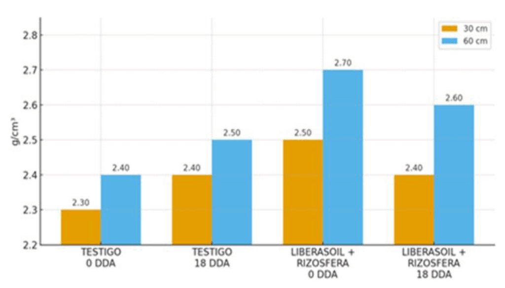 Asimismo, la masa radicular aumentó entre 85 y 112 % en comparación con la línea base, evidenciando un crecimiento vigoroso de raíces finas en los horizontes activos (30–50 cm). Esta respuesta biológica fue acompañada por una mejora en los parámetros físicos: la densidad aparente (ρb) se estabilizó en el rango de 0.9–1.1 g/cm³, mientras que la densidad real (ρs) se redujo ligeramente de 2.7 a 2.6 g/cm³, indicando una mayor aireación de microagregados y acumulación de materia orgánica activa. Estos resultados son consistentes con los reportes de Calvo et al. (2020) y Mendoza et al. (2022), quienes demostraron que los bioestimulantes radiculares y los surfactantes biológicos aumentan la biomasa radicular y la eficiencia de absorción de agua en suelos vitícolas compactados. En conjunto, el uso de Liberasoil + Rizosfera se confirma como una estrategia eficaz y sostenible de descompactación biológica, capaz de restaurar la estructura, mejorar la respiración radicular y optimizar la productividad de los viñedos bajo riego tecnificado.