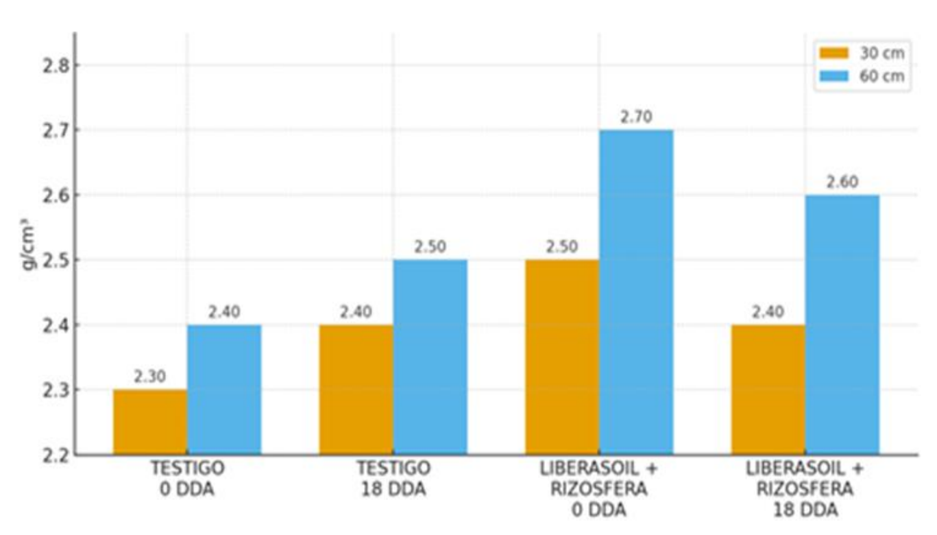 La densidad real (ρs) del suelo es un parámetro indicador de la composición mineral y estabilidad estructural, generalmente constante para cada horizonte. En este ensayo (Figura2), los valores iniciales variaron entre 2.3–2.7 g/cm³, lo que refleja un predominio de fracciones minerales finas (arcillo–limosas) con presencia de agregados estables. En el testigo, los cambios fueron mínimos entre 0 y 18 DDA (2.3–2.5 g/cm³), lo que indica una estructura inerte y sin alteración física significativa. En cambio, el tratamiento Liberasoil + Rizosfera mostró una ligera reducción de 2.7 → 2.6 g/cm³, interpretada como una mayor incorporación de aire en microagregados y apertura de microporos, resultado de la actividad surfactante de las saponinas y la acción biológica en la rizosfera (Raúl Yaipén Lab, 2023–2025). Este efecto concuerda con los hallazgos de Ferreyra et al. (2021), quienes reportaron que la disminución de ρs y la estabilización de la porosidad total están asociadas a una mejor oxigenación del perfil vitícola y una reducción de la resistencia mecánica.