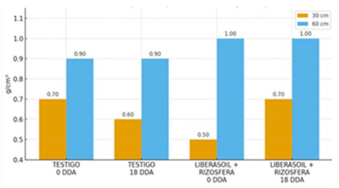 Figura 3: Comparación de Densidad aparente en el perfil del suelo por tratamiento Testigo y Liberasoil+ (20L) +Rizosfera ( 4L) evaluados en dos momentos 0DDA y 18 DDA