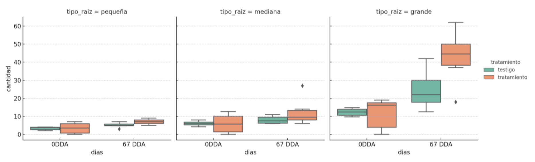 Nota. Cada panel representa un tipo de raíz (pequeña, mediana y grande). Se muestran las distribuciones de la cantidad de raíces a 0 y 67 días después de la aplicación (DDA) para el tratamiento (Liberasoil + Rizosfera) y el testigo. Las cajas indican los rangos intercuartílicos, las líneas horizontales muestran las medianas y los puntos representan valores atípicos. El uso de boxplots permite identificar diferencias en la mediana y dispersión de los datos entre grupos.
