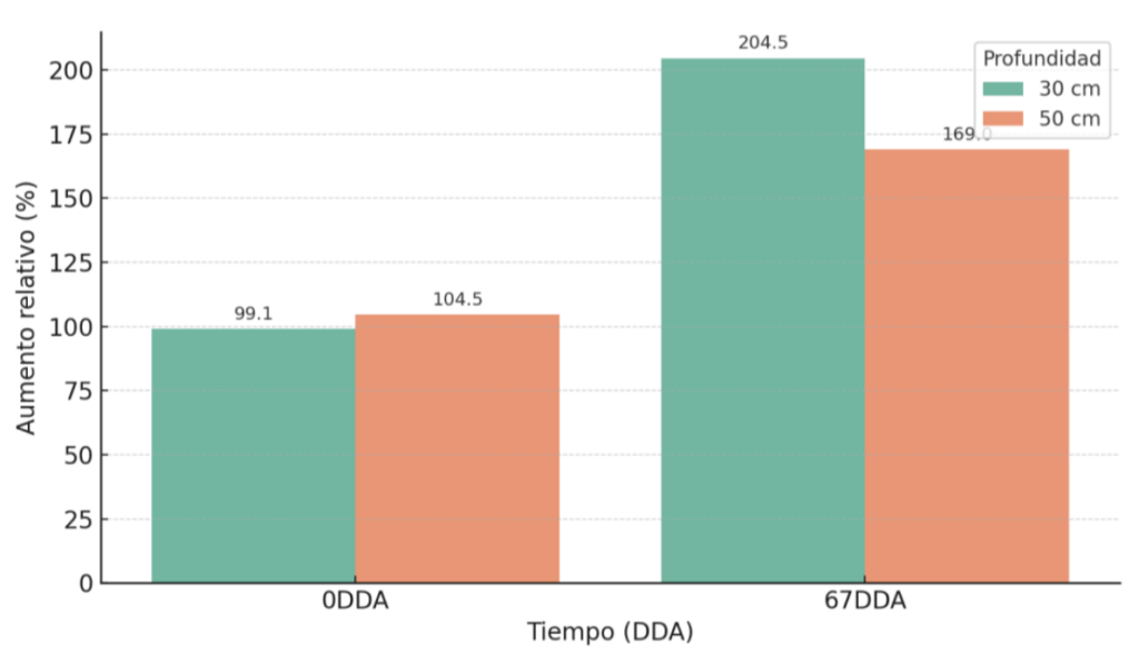 Nota. Se representa el porcentaje de aumento en la cantidad promedio de raíces con el tratamiento (Liberasoil + Rizófera) en comparación con el testigo, para dos profundidades del suelo (30 cm y 50 cm), a los días 0 (0DDA) y 67 (67DDA) después de la aplicación. Se destaca un aumento superior al 200% en el estrato de 30 cm a los 67DDA, confirmando el efecto acumulativo del tratamiento.