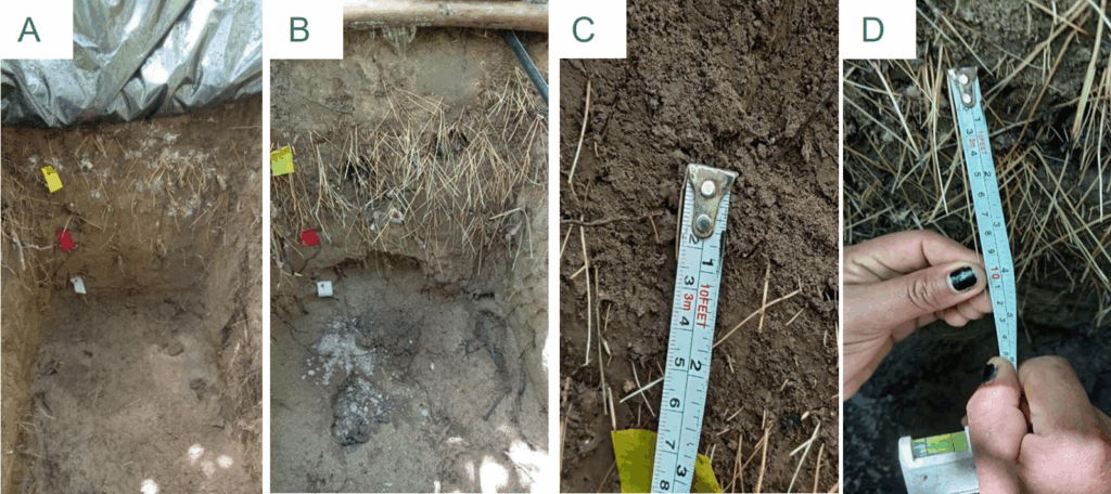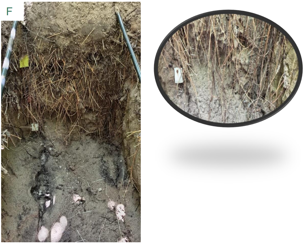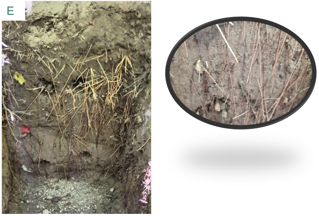 Figura 7: Metodología de la aplicación: E. Calicata del tratamiento testigo a los 67 DDA, donde se observa menos crecimiento radicular. F. Calicata del Tratamiento Rizósfera + Liberasoil, donde se observa mayor crecimiento radicular a los 67 DDA en el estrato de 20 a 40 cm de profundidad.