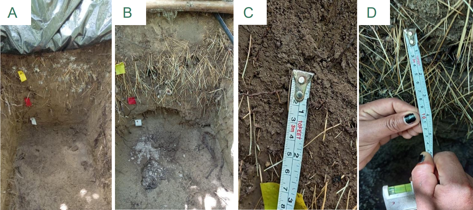 Figura 6: Metodología de la aplicación: A. Calicata del tratamiento testigo. B Calicata del Tratamiento Rizósfera + Liberasoil. C. Toma de variable de tamaño de raíces en el testigo. D. Toma de datos de variable tamaño de planta en el tratamiento Rizósfera 10 L/Ha+ Liberasoil 2 L/ Ha a los 0 DDA.