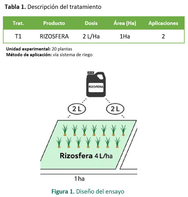 Se efectuaron dos aplicaciones del producto RIZOSFERA cada una con una dosis de 2 L/Ha vía sistema de riego, una aplicación inicial y posteriormente a los 15 días de inicio del ensayo.